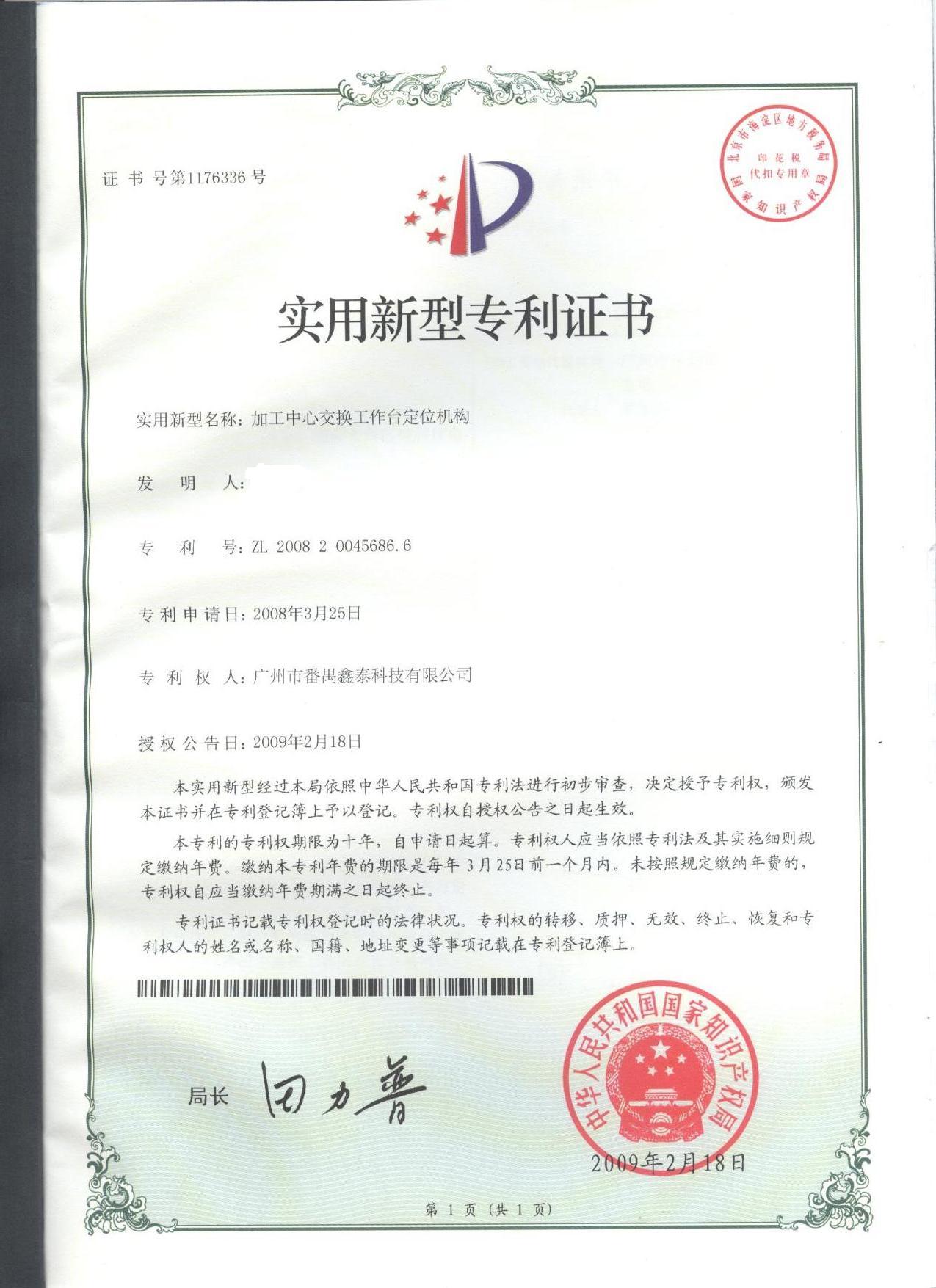 經過公司技術部門員工的辛勤努力,鑫泰集團獲得“加工中心交換工作臺定位機構”的實用新型專利