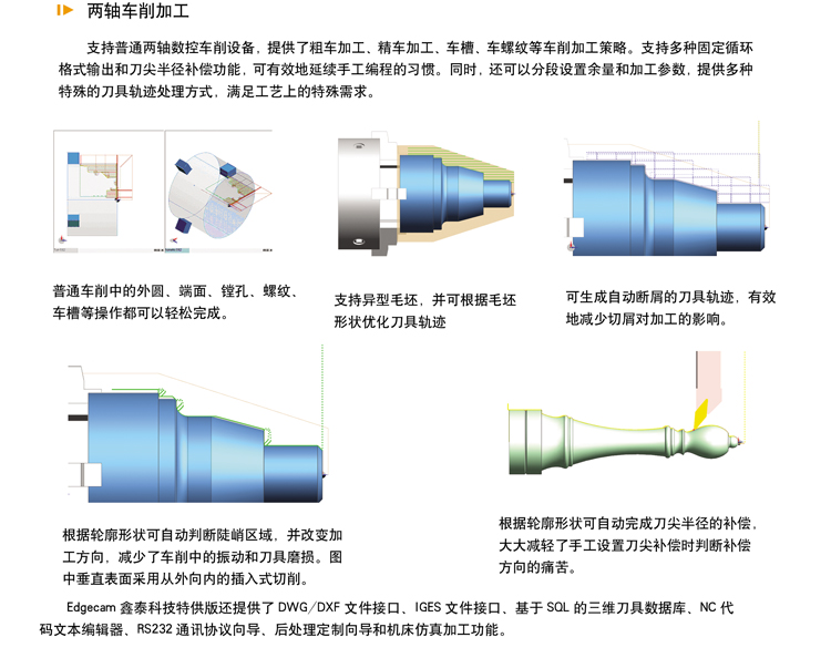 作為Edgecam在中國(guó)大陸地區(qū)的機(jī)床合作伙伴,鑫泰科技還向用戶提供Edgecam軟件的后續(xù)服務(wù)。Edgecam鑫泰科技特供版提供兩軸車削或三軸銑切的編程功能,并可根據(jù)用戶的生產(chǎn)需要升級(jí)到更高功能的模塊。